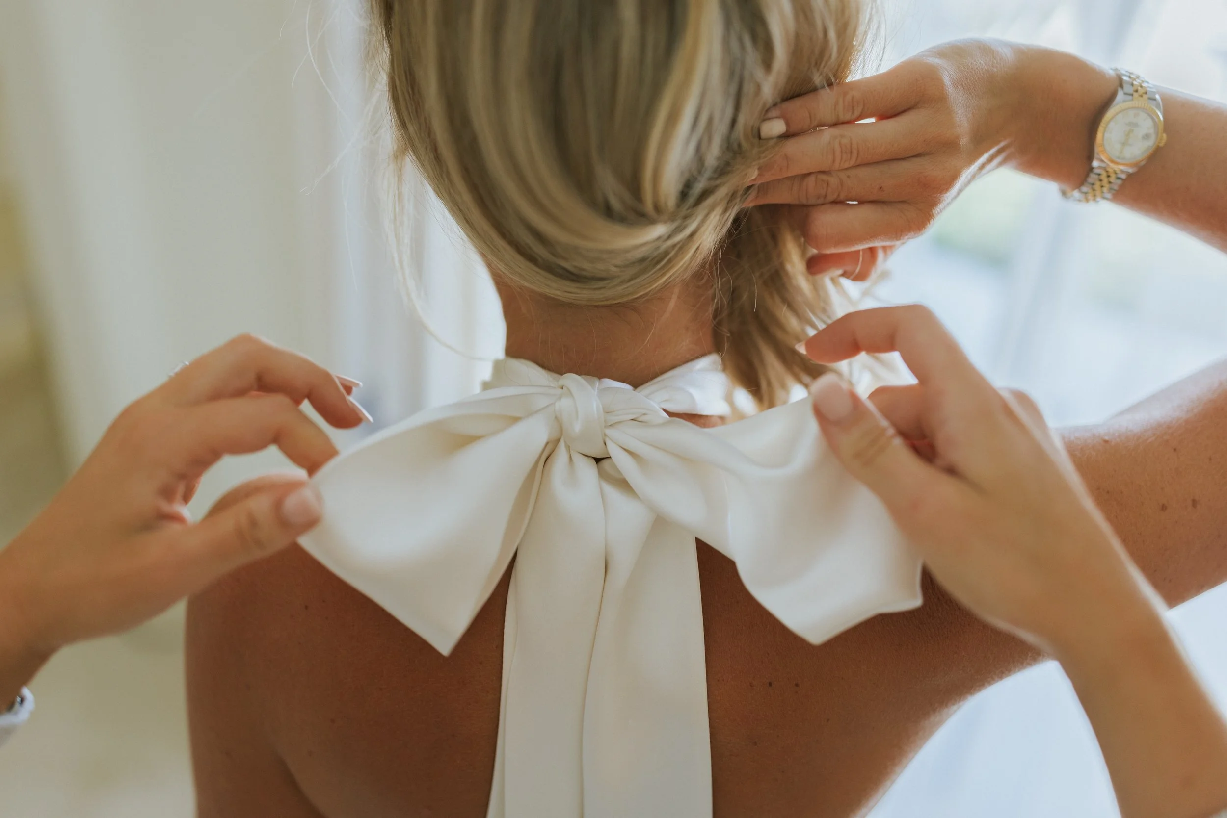 Our goal is to make you feel like the best version of yourself, so we love creating pieces that can be styled in different ways, allowing you to express your individuality and personal style. The Cheryl can either be styled in a beautiful bow at the nape of the neck, or tied around the waist, creating an entirely different look. Tiffany decided on the first option, adding a wonderfully playful element to her look.