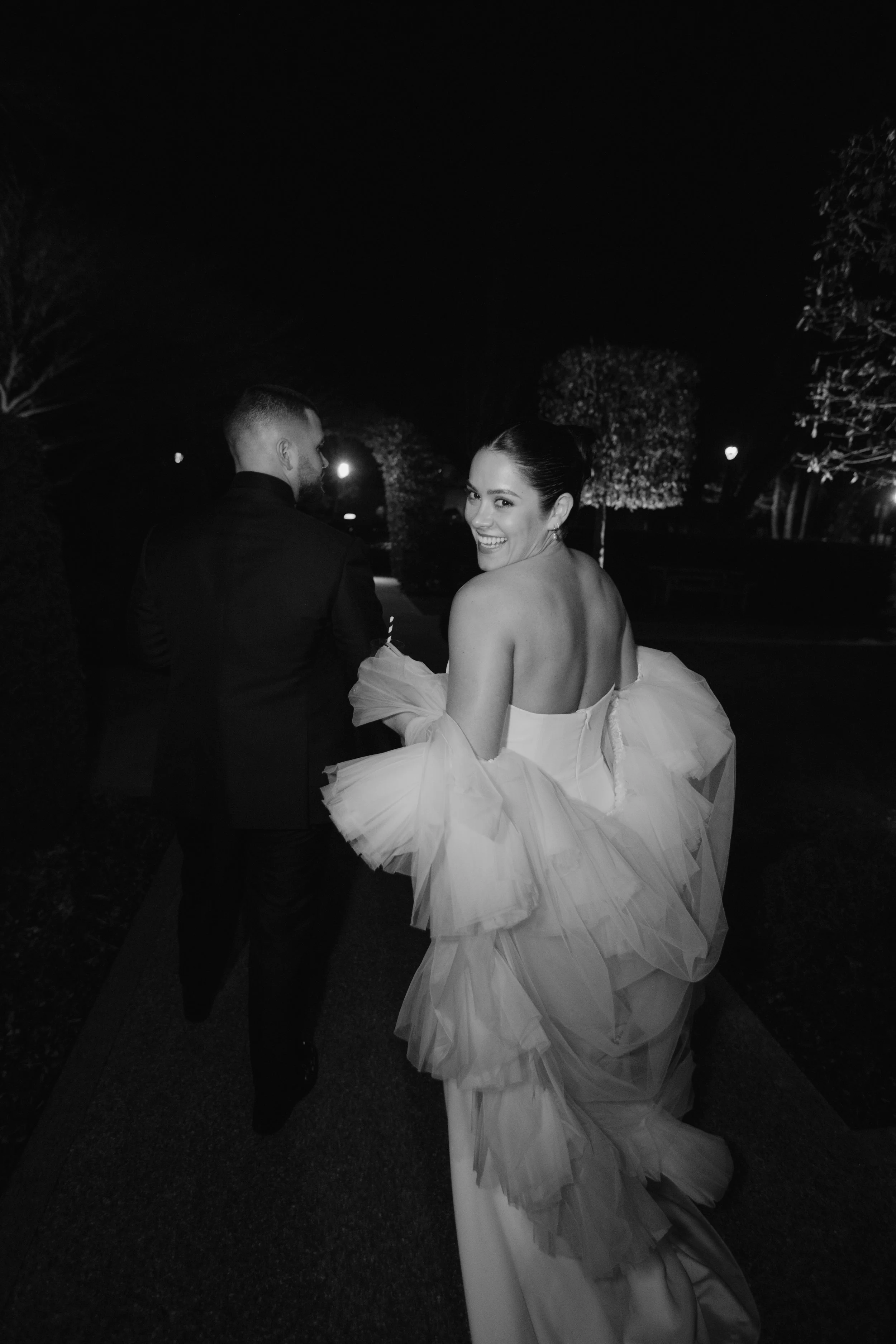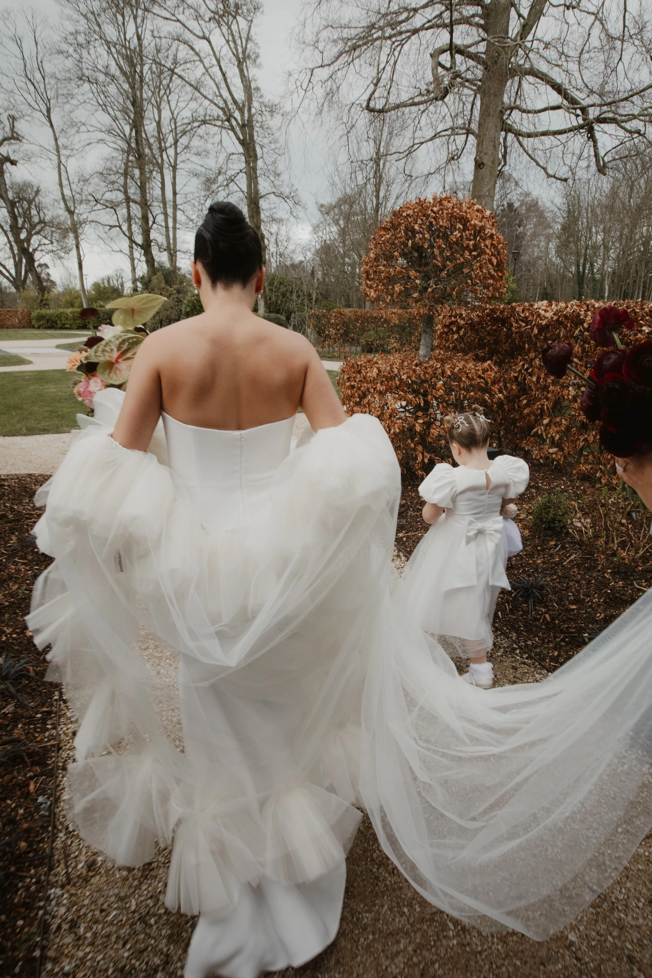 The veil became a defining feature of the look. “I wanted something dramatic that would cover my face as I walked down the aisle, and the Periwinkle delivered exactly that.” Its versatility added another layer of intention, transforming seamlessly later in the day. “I loved how it could turn into a shrug—it completely changed my look.”