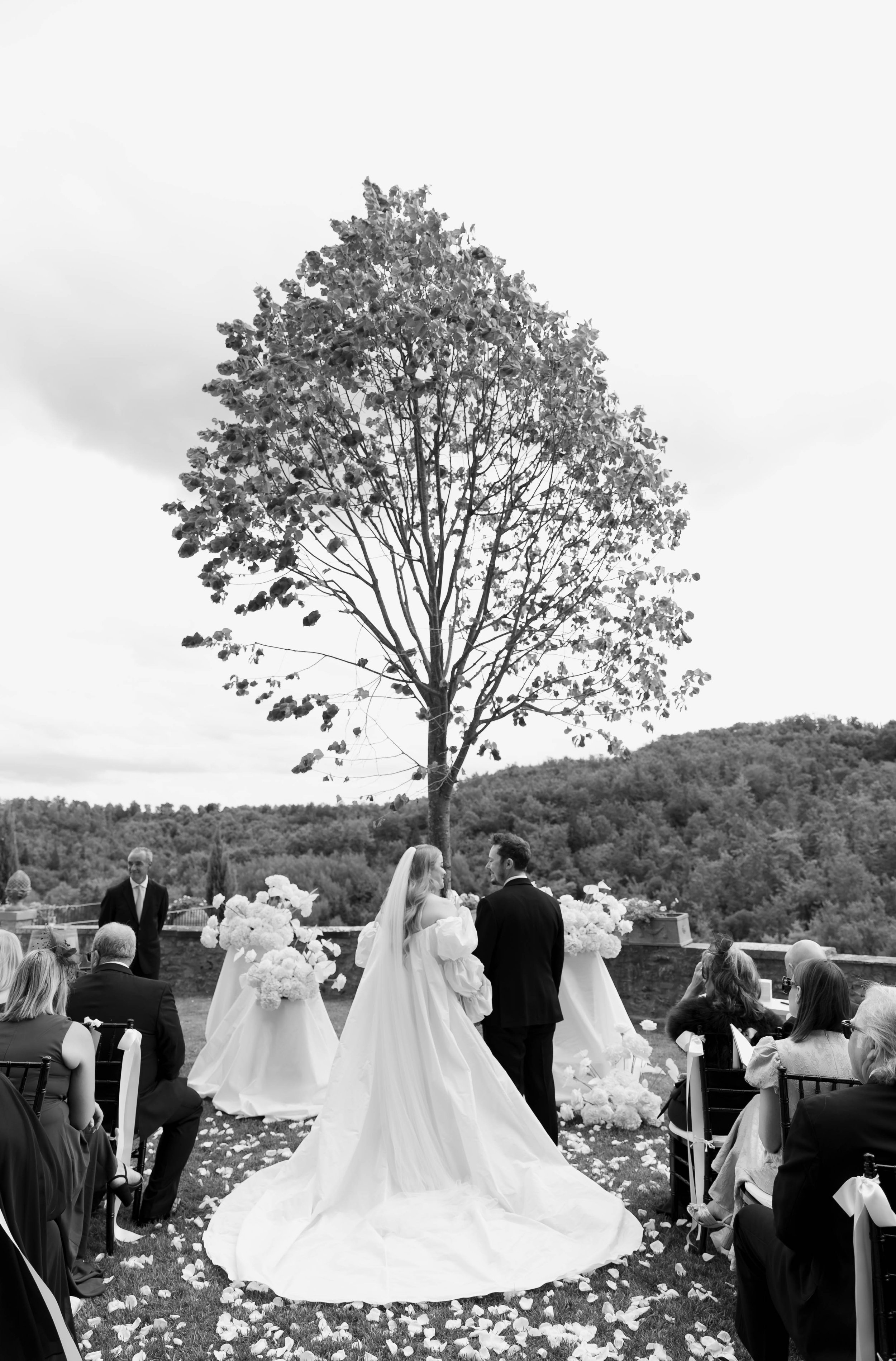 A refined Tuscan celebration where sculptural design met timeless black-tie elegance.