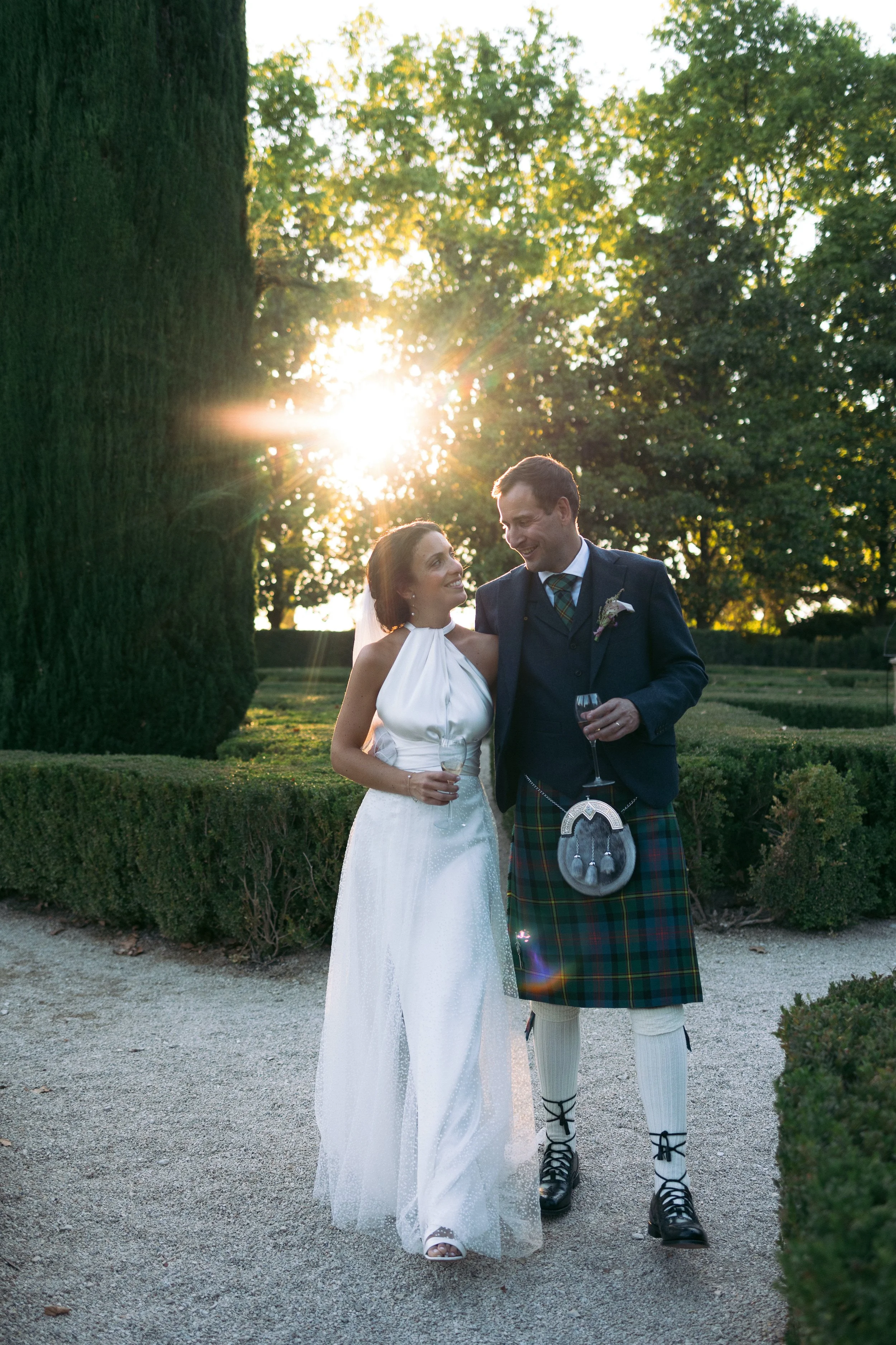 This stunning Provence wedding features soft-toned florals and a silk, halter neck Halfpenny London gown.